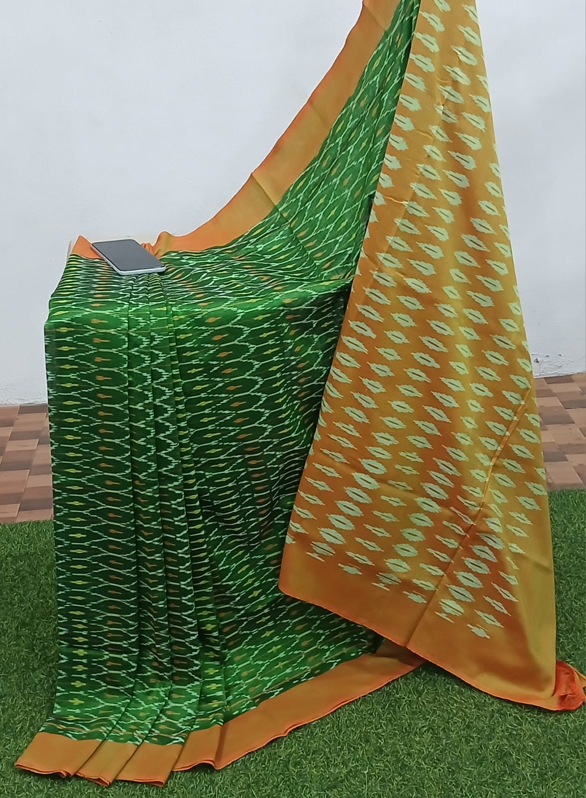 Premium Ikkat Maciress Cotton Saree with vibrant handloom patterns, soft mercerised cotton feel, elegant border and breathable comfort – perfect for everyday and festive wear.