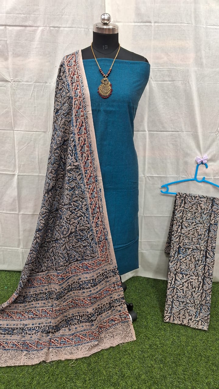 The dress material shown here blends a fresh olive-green top with a rich, intricately printed Kalamkari dupatta and bottom, creating the perfect balance of simplicity and heritage.
