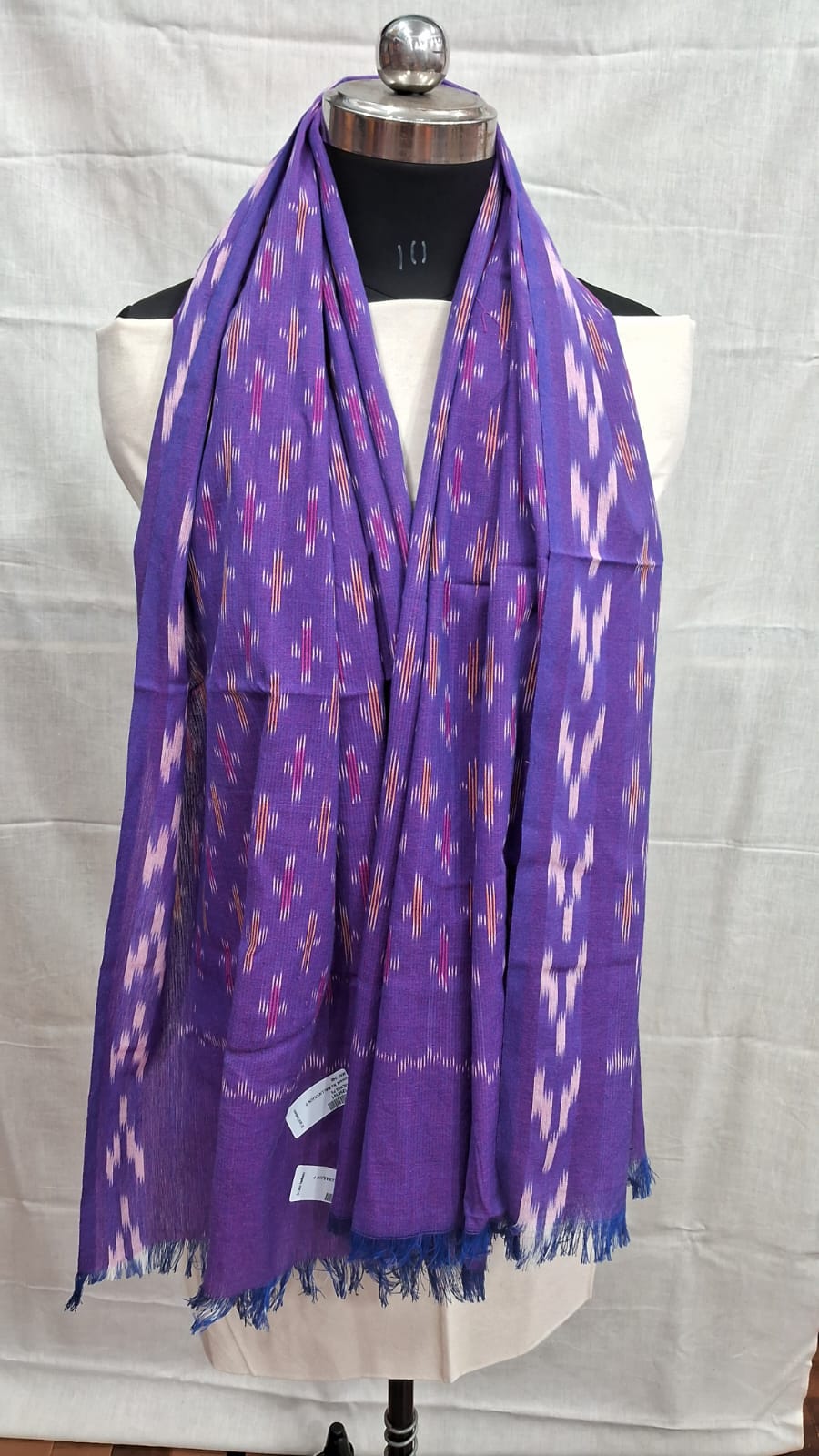 This Pochampally ikkat cotton shawl showcases the beauty of traditional handloom weaving in a rich purple tone, highlighted with classic ikkat motifs in subtle contrasting shades. Crafted from pure cotton, the fabric is soft, breathable, and lightweight, making it perfect for all-day comfort.